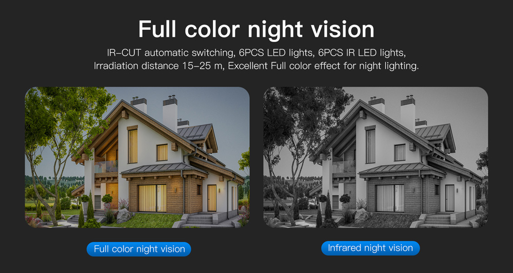 Night vision: IR-CUT with auto-switching,6 pcs LED lights, 6 pcs IR LED lights, Irradiation distance: 15~25 m, Red and blue lights alarm