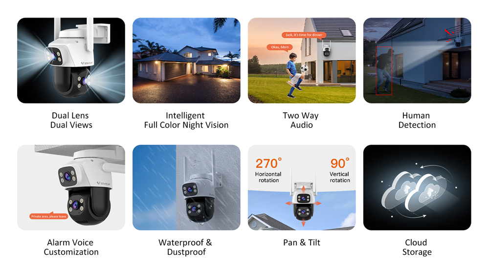 -Alarm detection: Motion detection, human detection, human framing, siren alarm, and area detection