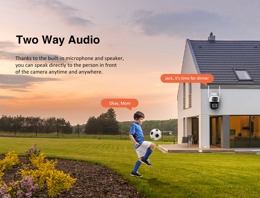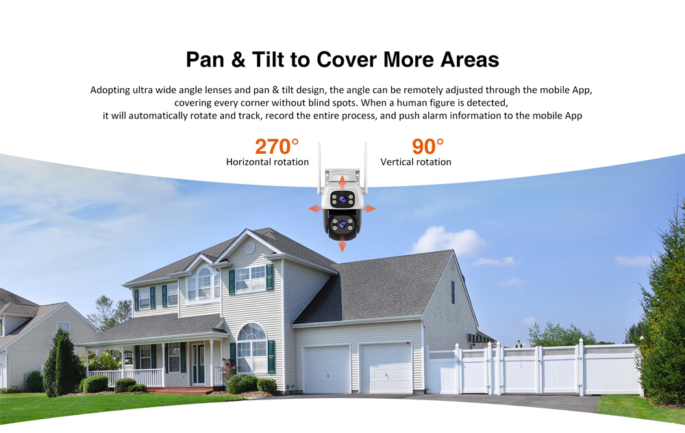 Ενσωματώνει 2 φακούς που επιτρέπουν μεγαλύτερη κάλυψη στον χώρο και υποστηρίζει PTZ λειτουργία που σας επιτρέπει την οριζόντια και κάθετη μετακίνηση της κάμερας μέσω της εφαρμογής.
